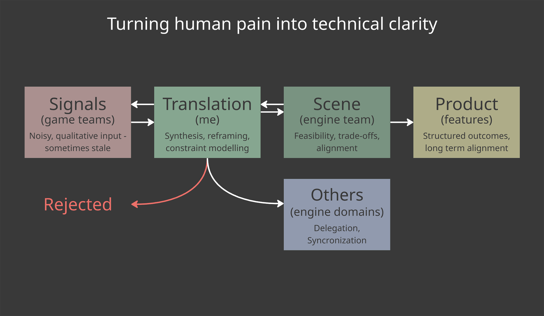Frostbite is a vast organization with multiple layers, divisions, and deeply interconnected technical domains. Scene had operated without a PM for two years. This left ownership unclear and most product responsibilities absorbed into Engineering. Prioritization came from above, limiting local decision-making, and heavy process requirements made it difficult to reach end-users beyond a few power users. Navigating this environment required working in a space where authority was limited, expectations not always clear, and an engineering culture dominating nearly all discussions.